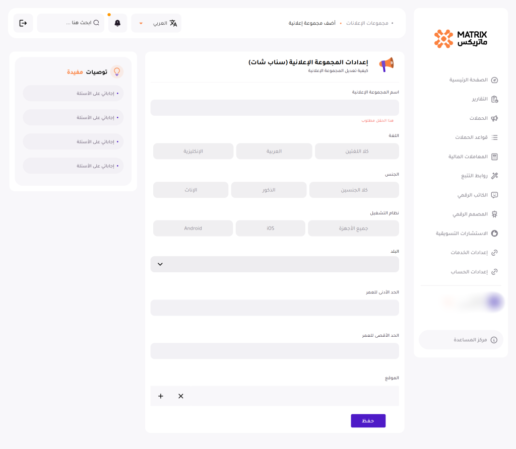 بعد ربط متجرك الإلكتروني بمنصة ماتريكس وربط المنصات الإعلانية، يمكنك بسهولة إطلاق حملاتك الإعلانية عبر خطوات سهلة. في